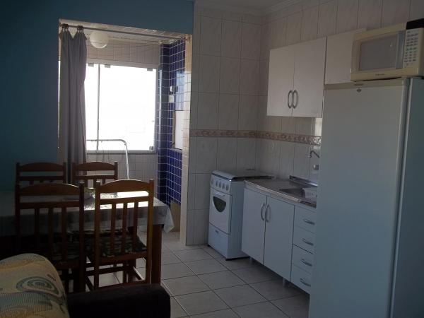 Sala/cozinha com fogão, galadeira, forno microondas, mesa para 4 pessoas, TV LED 20", bicama. Área de serviço com tanque e churrasqueira