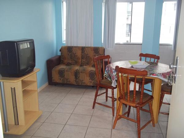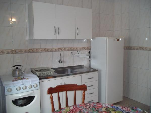 Sala/cozinha com fogão, galadeira, forno microondas mesa para 4 pessoas, TV 14", bicama.Um banheiro.