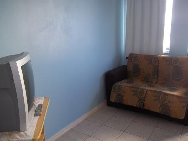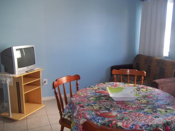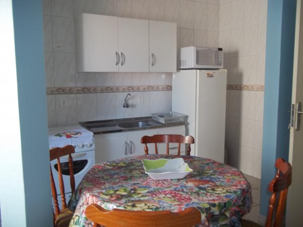 Sala/cozinha com fogão, galadeira, forno microondas mesa e utensílios para 4 pessoas, TV LED 20', bicama.Um banheiro.