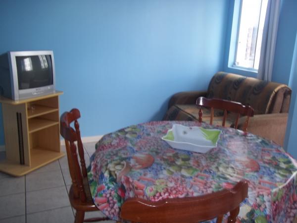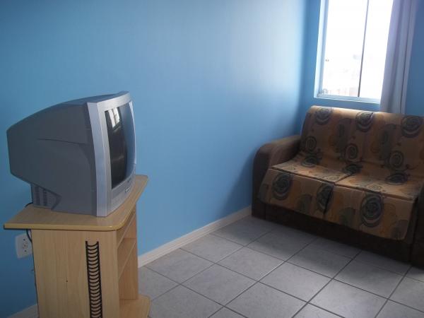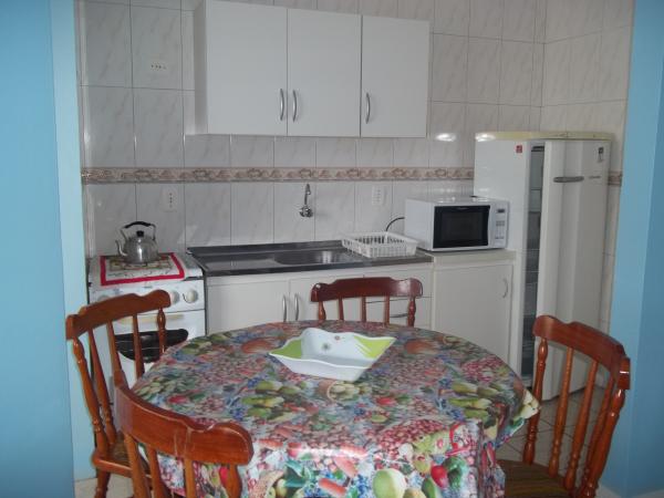Sala/cozinha com fogão, galadeira, forno microondas, utensílio de cozinha e mesa para 4 pessoas, TV 20", bicama.Um banheiro.