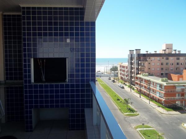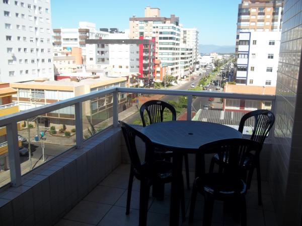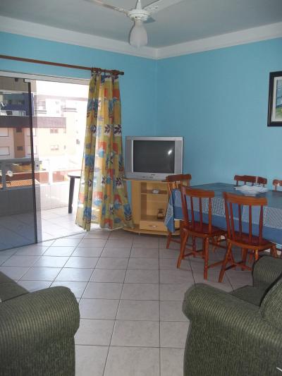 Apartamento no 6º andar. Suíte com cama de casal, roupeiro e ventilador de teto, quarto com treliche roupeiro e ar condicionado, ante sala com bicama, cozinha com geladeira, fogão com acendimento automático, forno microondas, área de serviço com tanque, sala com sofás, TV29", mesa de jantar para 6 pessoas, ventilador de teto, sacada com churrasqueira, espetos e mesa de jardim de frente para a AV. Ruda. Orientação solar oeste (todos os cômodos) sala e sacada sul. WI-FI.