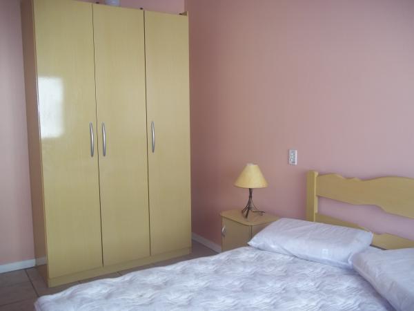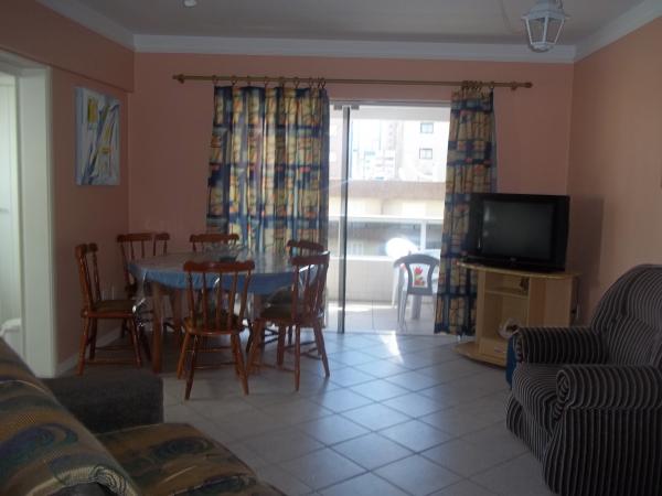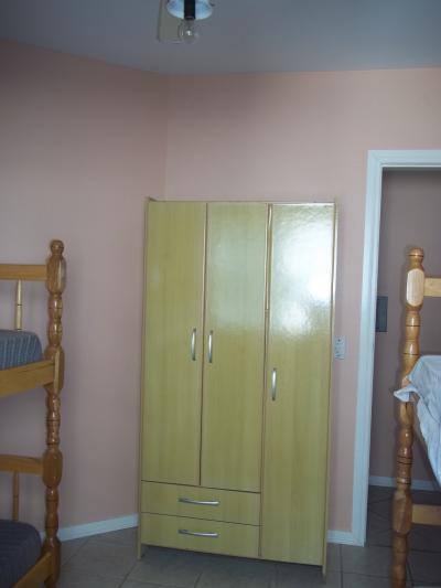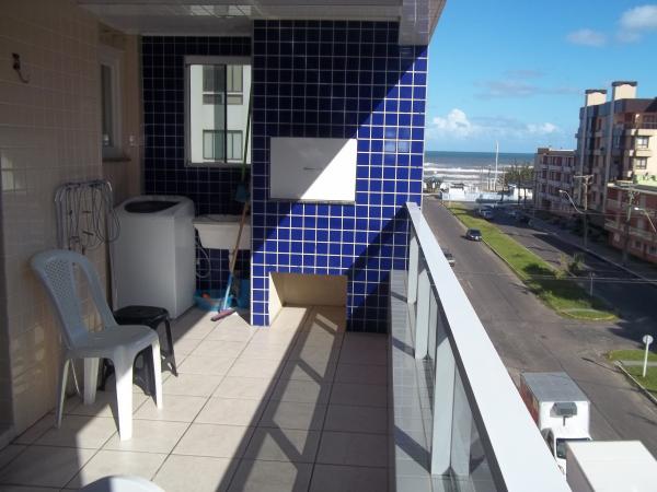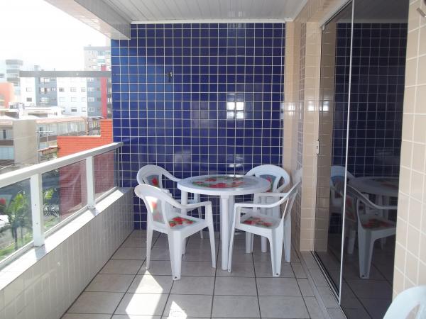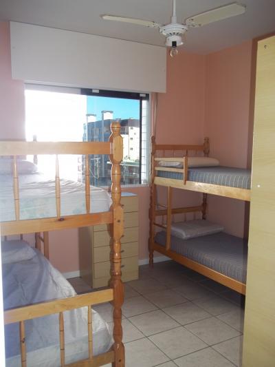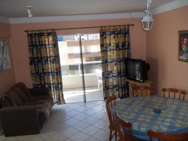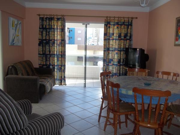 Apartamento no 4º andar. Suíte com cama de casal com colchão de molas, roupeiro e ventilador de teto, amplos banheiros (dois incluíndo o da suíte),quarto com dois beliches, cômoda, roupeiro e ventilador de teto, sala com sofás, TV 29", mesa de jantar e utensílios de cozinha para 6 pessoas, cozinha sob medida com geladeira biplex, fogão com acendimento automático, forno microondas, ampla sacada de frente para a Av. Rudá, vista para o mar com mesa de jardim, churrasqueira, espetos, tanque e máquina de lavar roupas 6 Kg. Orientação solar leste (quartos, banheiros e cozinha) sala e sacada sul. Acomoda 6 pessoas. WI-FI